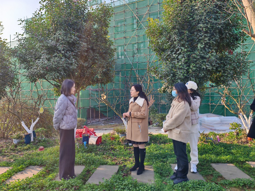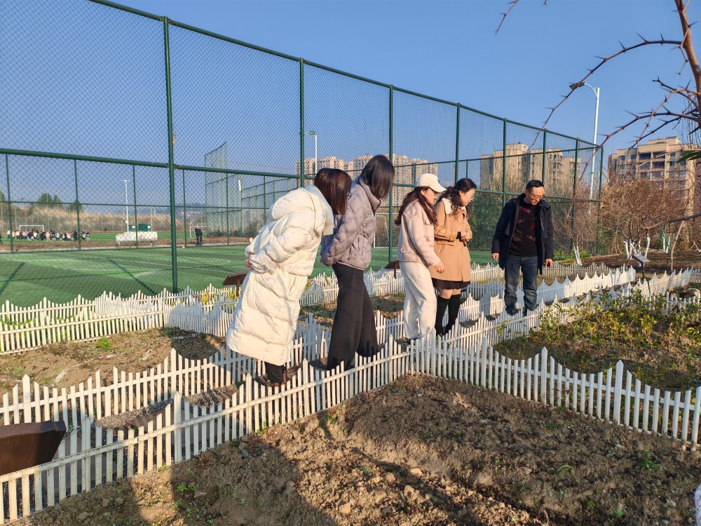 区卫健局领导与天台路小学负责人对接中草药种植基地迁移事宜,并视察中医药文化展示区域初步建设情况